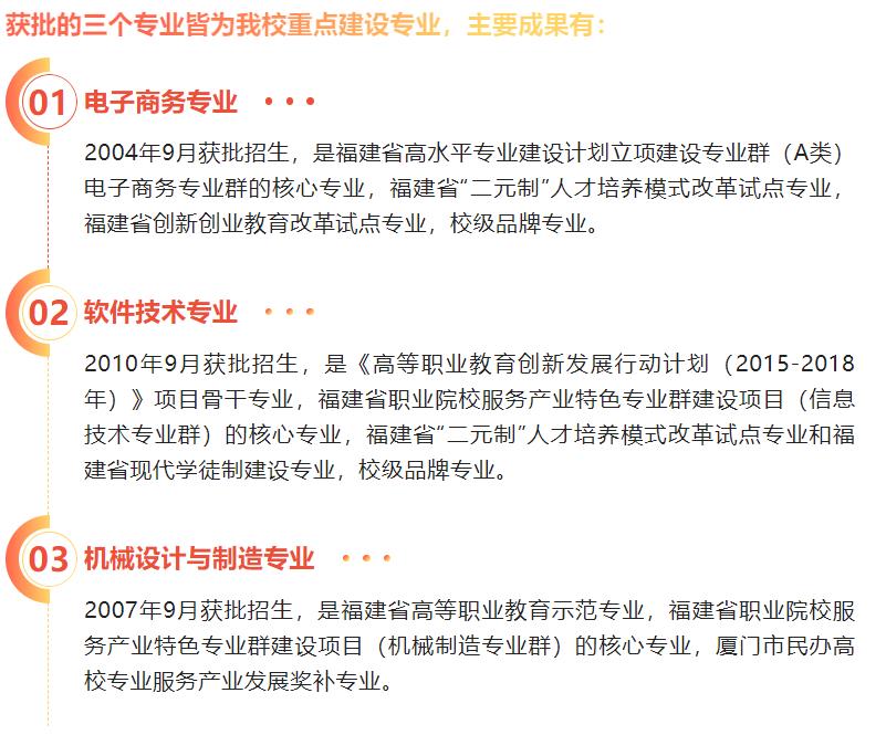 近日,厦门市教育局公布了“厦门市高职高水平专业立项建设名单”,我校按最高限额申报的电子商务、软件技术和机械设计与制造等三个专业全部获得立项,这是我校专业内涵建设再获重大成果,也是本科层次职业教育专业培育取得阶段重大进展。我校将认真贯彻落实厦门市职业教育创新发展高地建设有关文件精神,紧紧围绕提升立德树人水平、专业发展水平、教学改革水平、师资队伍水平、实践教学水平、信息化建设水平、对外合作水平、服务发展水平等方面开展高水平专业建设,打造职教品牌新范式,保质保量完成专业建设任务和绩效目标,同时通过项目建设,相关专业基本达到试办本科层次职业教育要求。